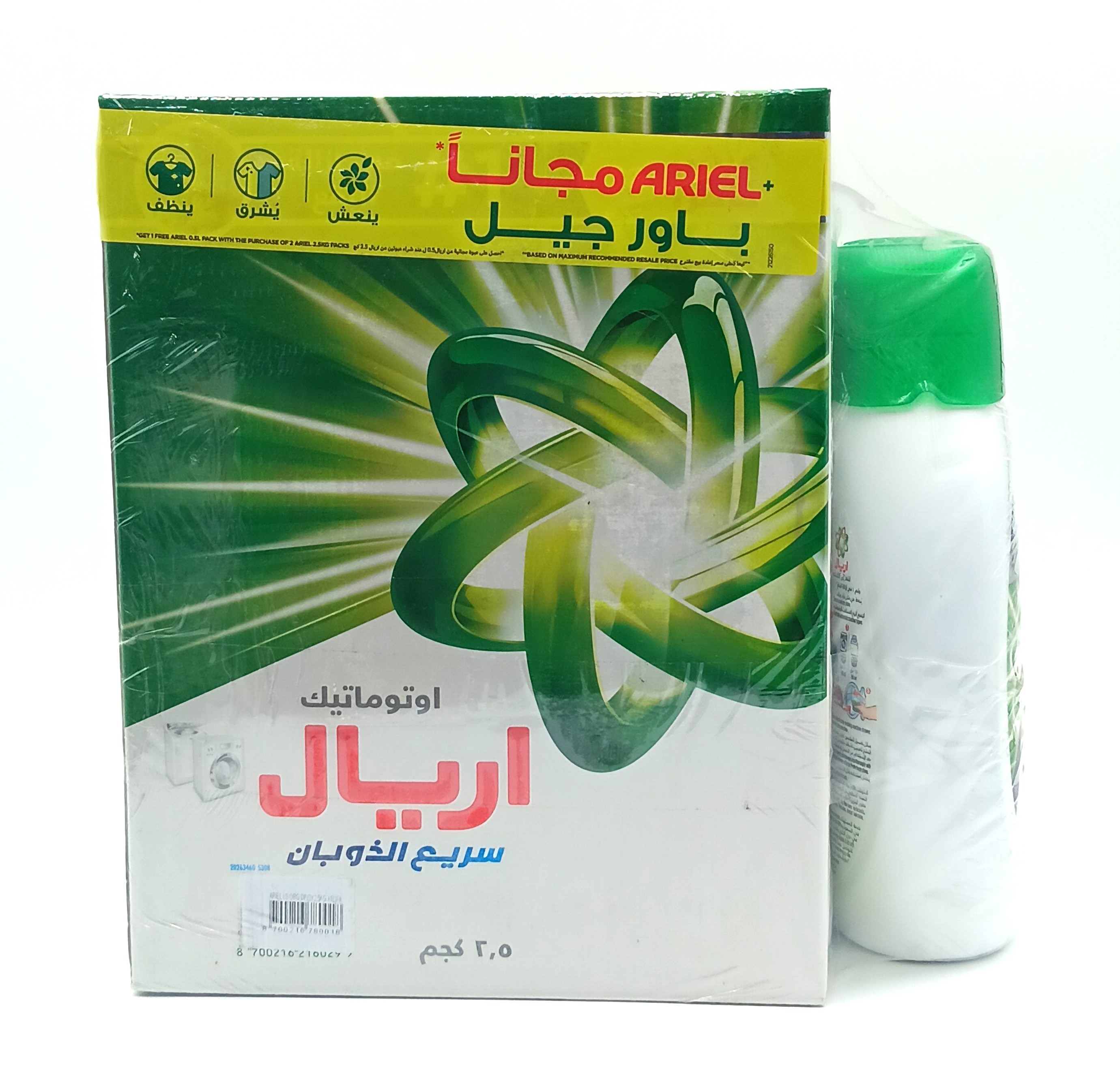 اريال مسحوق غسيل وتنظيف الملابس سريع الذوبان للغسالات الاوتوماتيكية 2.5 كجم عبوتين + 1 لتر اريال جل باللافندر