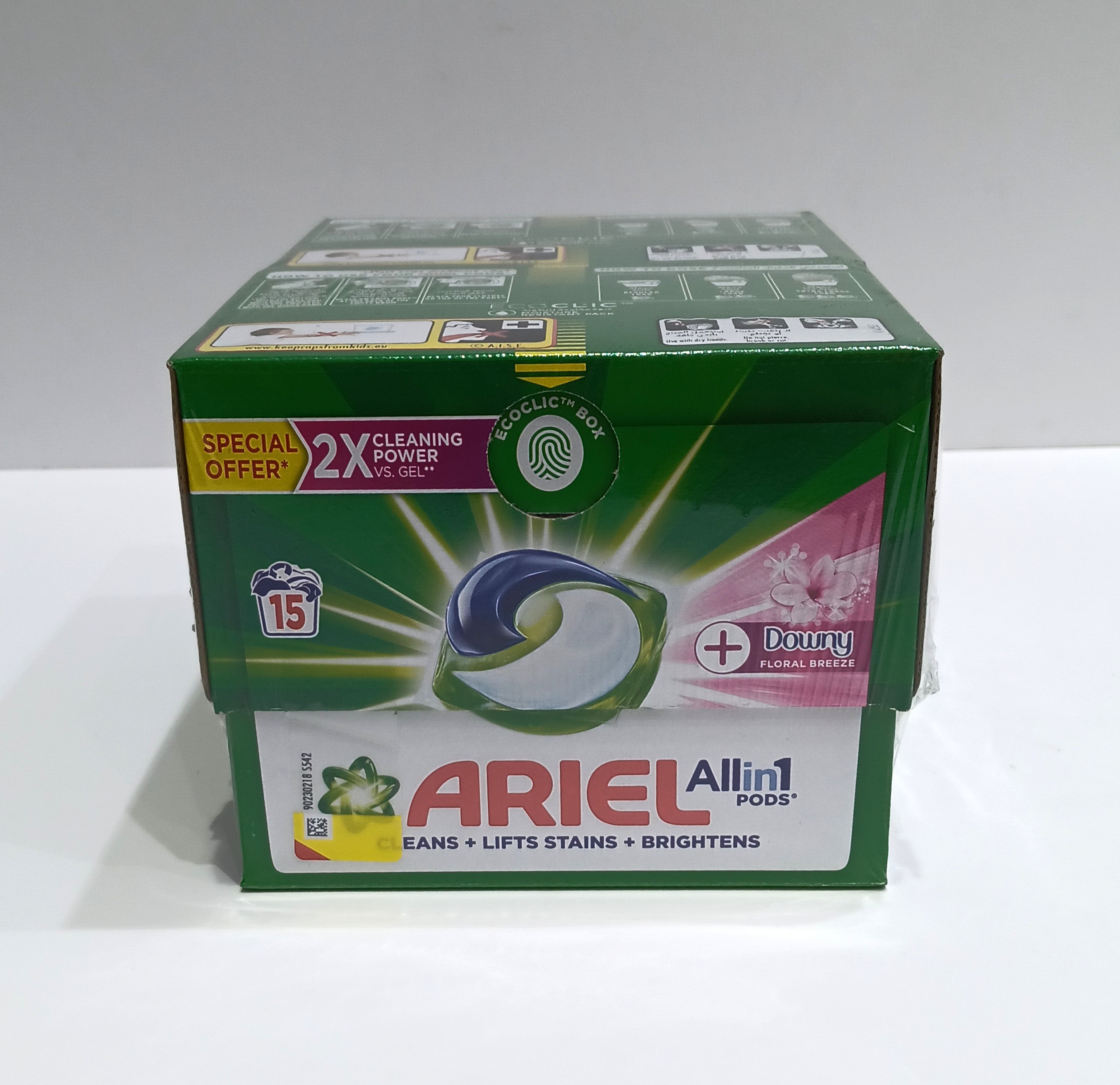 اريال كبسولات الكل في 1 سائل غسيل ملابس واقمشة مع لمسة انتعاش داوني عبوة اقتصادية 15 كبسولة