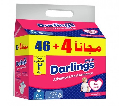 دارلينغز حفاضات اطفال جديدة ومتطورة ماكسي بلاس مقاس 5 ( 12-25 كجم ) وسط 50 قطعة