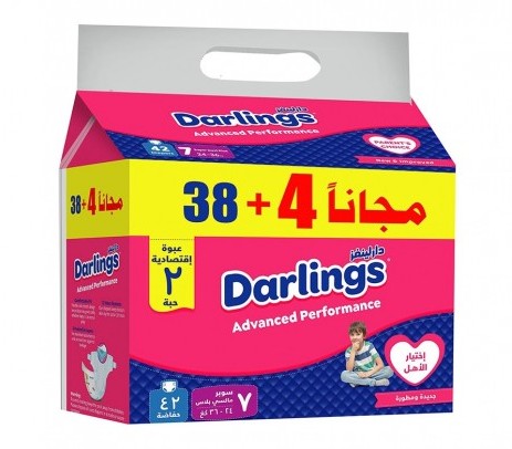 دارلينغز حفاضات اطفال جديدة ومتطورة سوبر ماكسي بلاس مقاس 7 ( 24-36 كجم ) وسط 42 قطعة