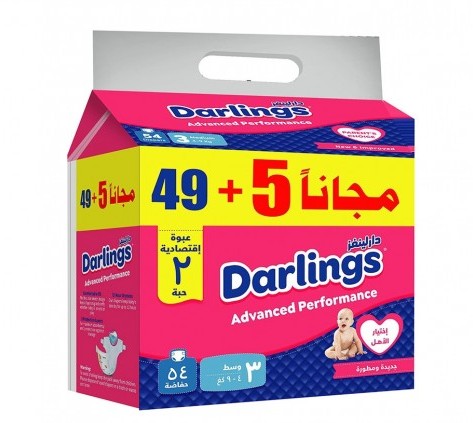 دارلينغز حفاضات اطفال جديدة ومتطورة مقاس 3 ( 4-9 كجم ) وسط 54 قطعة
