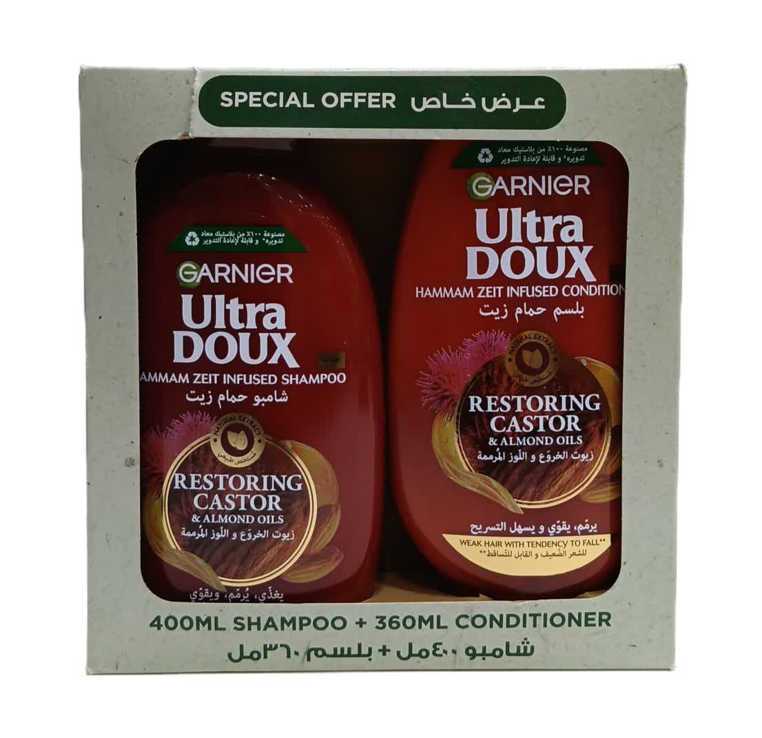 غارنييه الترا دو شامبو الشعر بخلاصة زيت الخروع و اللوز المرممة 400 مل + 360 مل بلسم