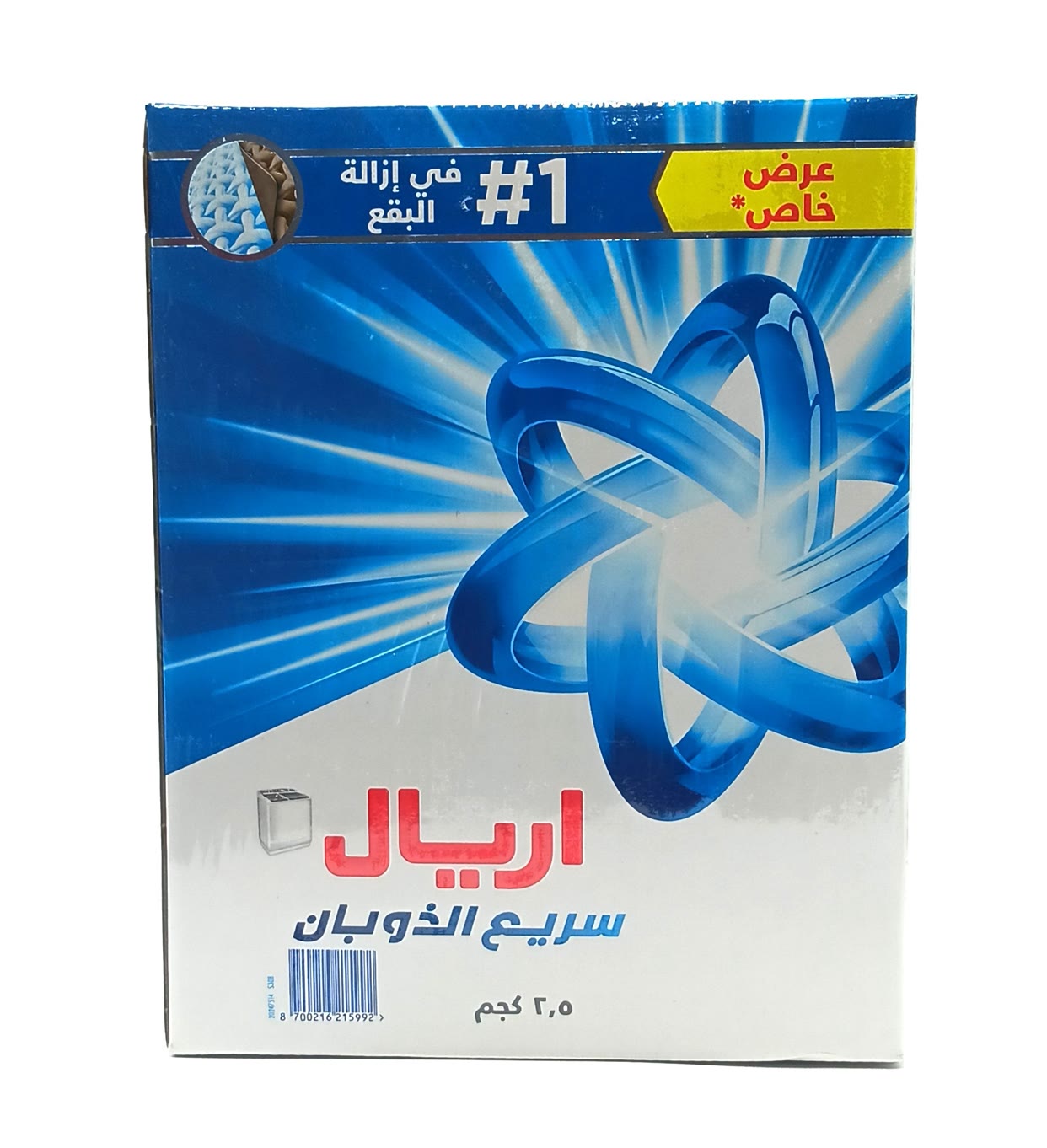 اريال مسحوق غسيل وتنظيف الملابس سريع الذوبان الازرق 2.5 كجم عبوتين عالي الرغوة