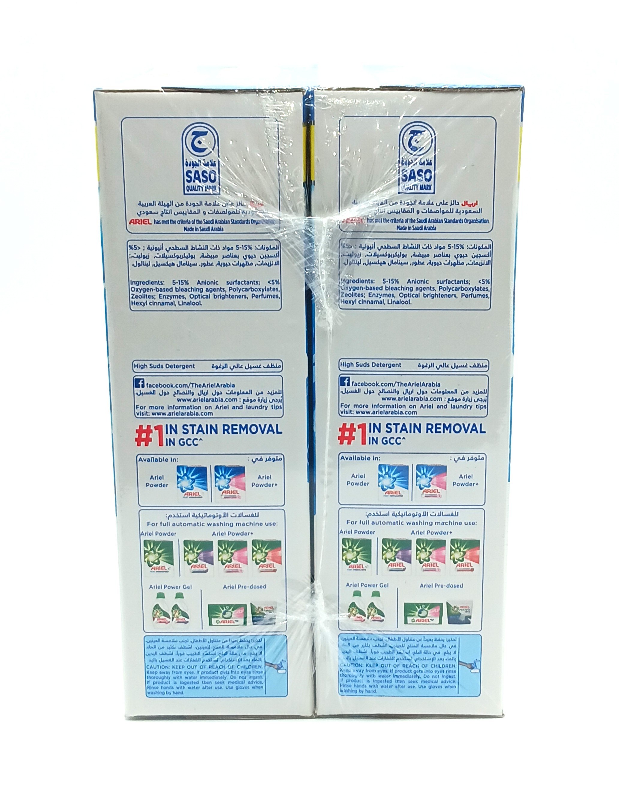 يتميز بتركيبته المبتكرة التي تذوب بسرعة في الماء، وتنشط فورًا، وتتغلغل بعمق في الأقمشة لتزيل البقع بشكل تام إن تركيبة هذا المنتج تذوب بسرعة في كل غسلة إزالة تامة للبقع: إن التركيبة المطوّرة لهذا المسحوق تتغلغل بعمق في أقمشة ملابسك. وتفكك حتى البقع العالقة لتزيلها بالكامل إن مسحوق اريال للغسيل يذوب بسرعة في الماء ولا يترك أي رواسب على الملابس إن هذا المسحوق مناسب لمجموعة كبيرة من الأقمشة والألوان. اختر هذا المسحوق المتعدد الاستخدامات الذي يلبي جميع احتياجاتك.