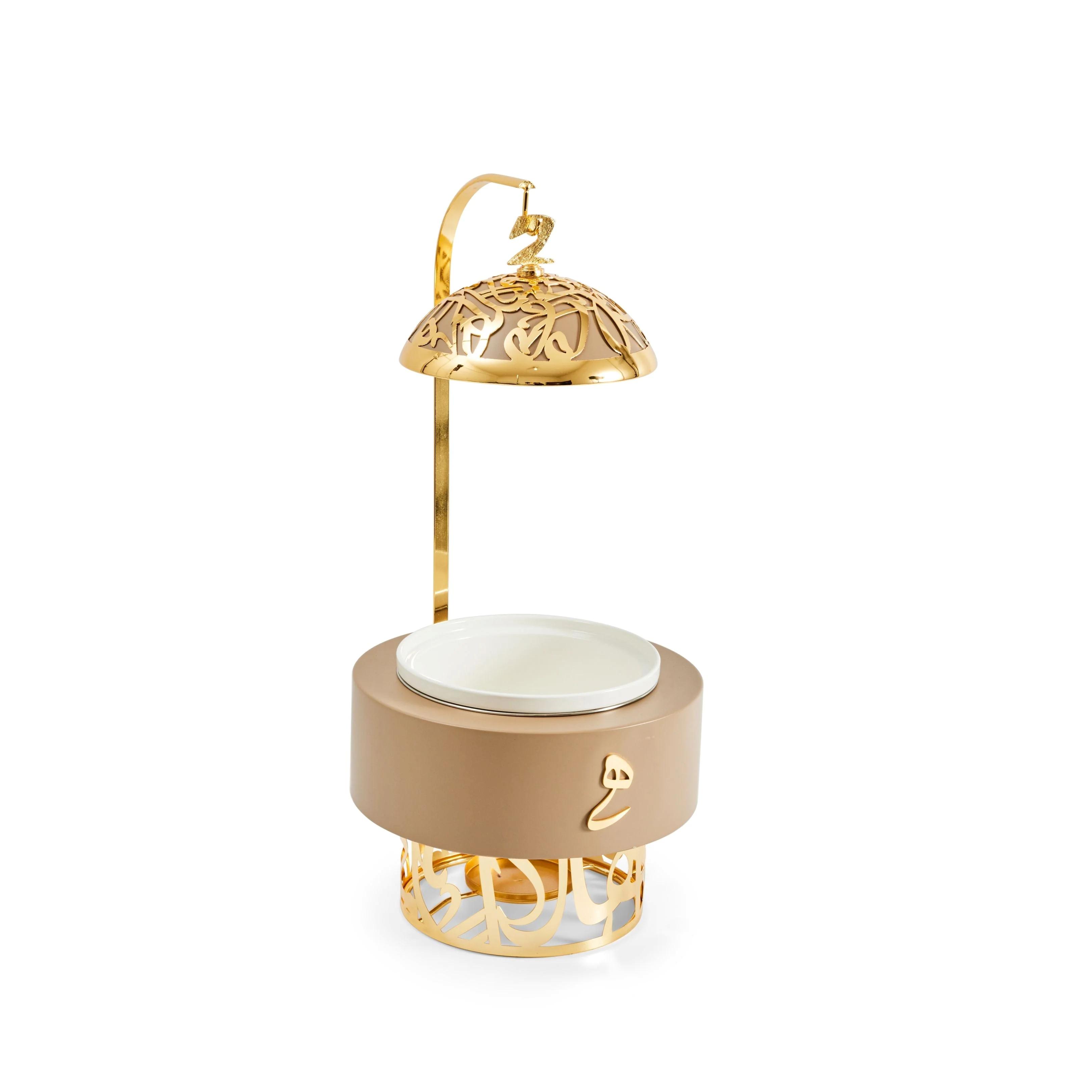 • مزود بغطاء معدني مميز يحمل نفس العبارة بالخط العربي المزخرف، مع إضافة لمسة من العملية والتفاصيل الدقيقة تحتوي مقدمة الغطاء على عليقة تمكنك من تعليق الغطاء في حامل البوفيه.