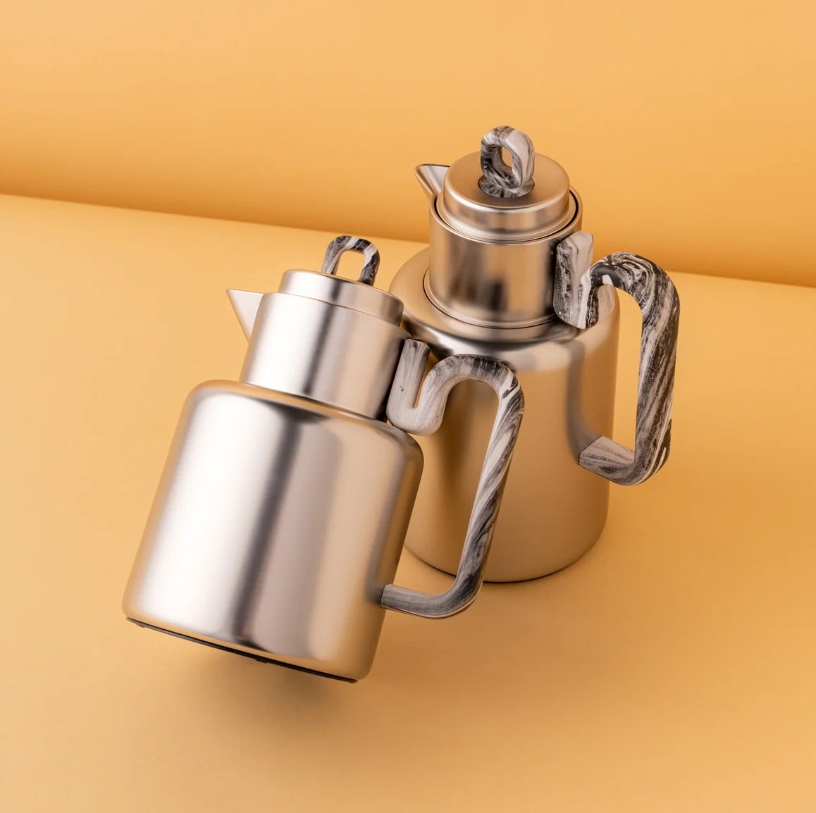 طقم مكون من مطارتين السعة: 1 / 0.5 لتر -الجدار الخارجي: ستيل مقوى الداخل: زجاج - الغطاء: كبس - يحفظ الحرارة لمدة 8 ساعات