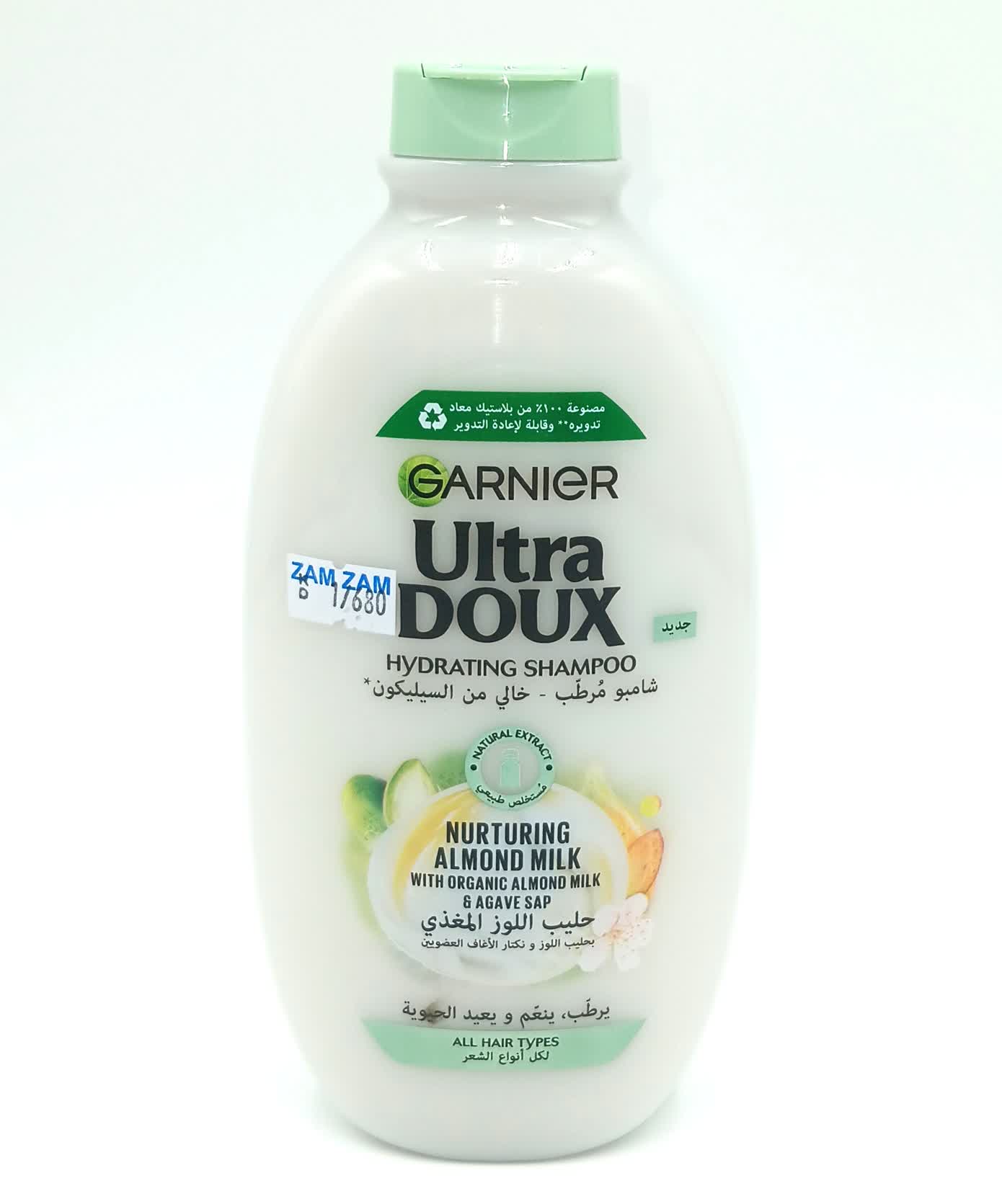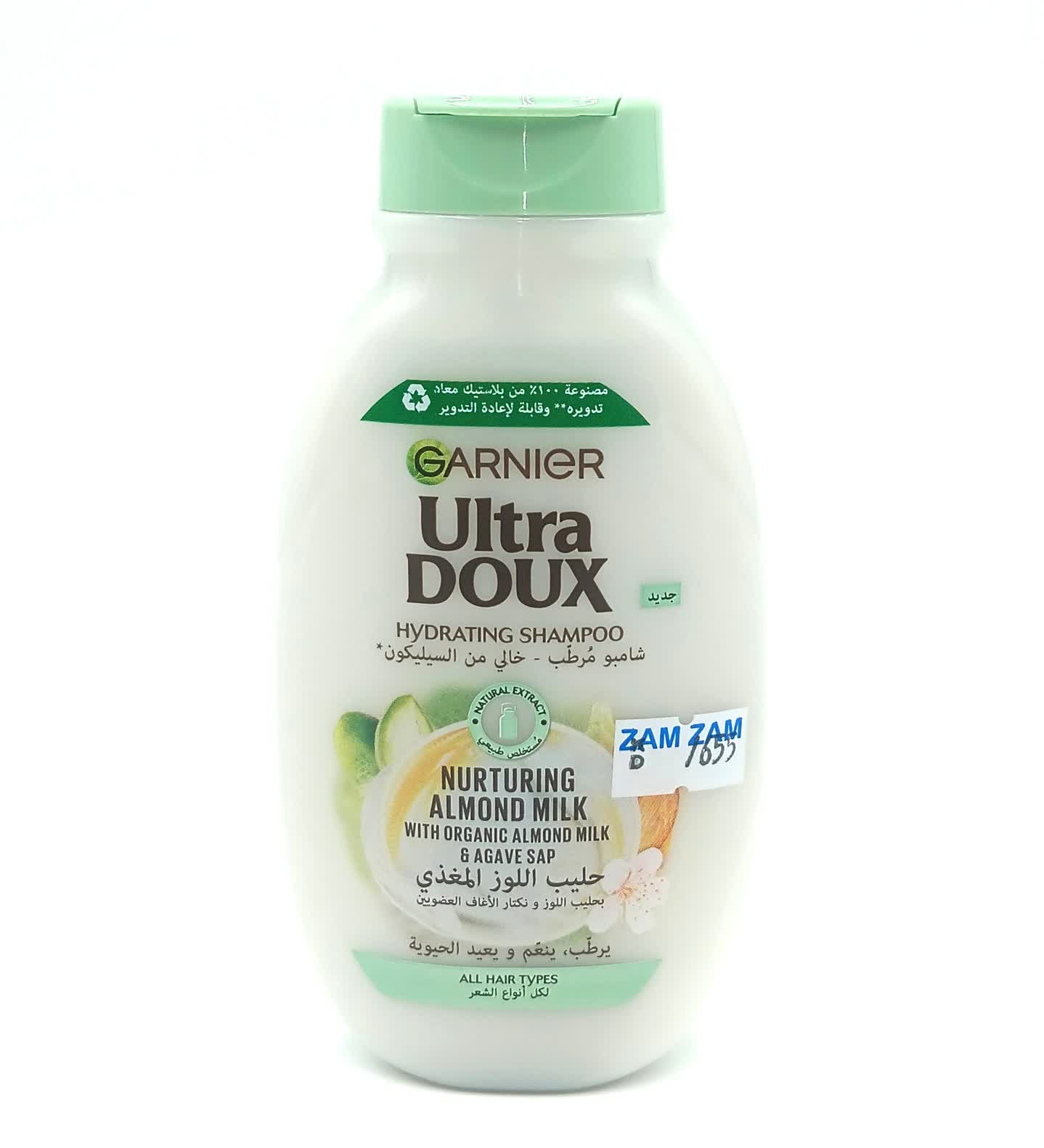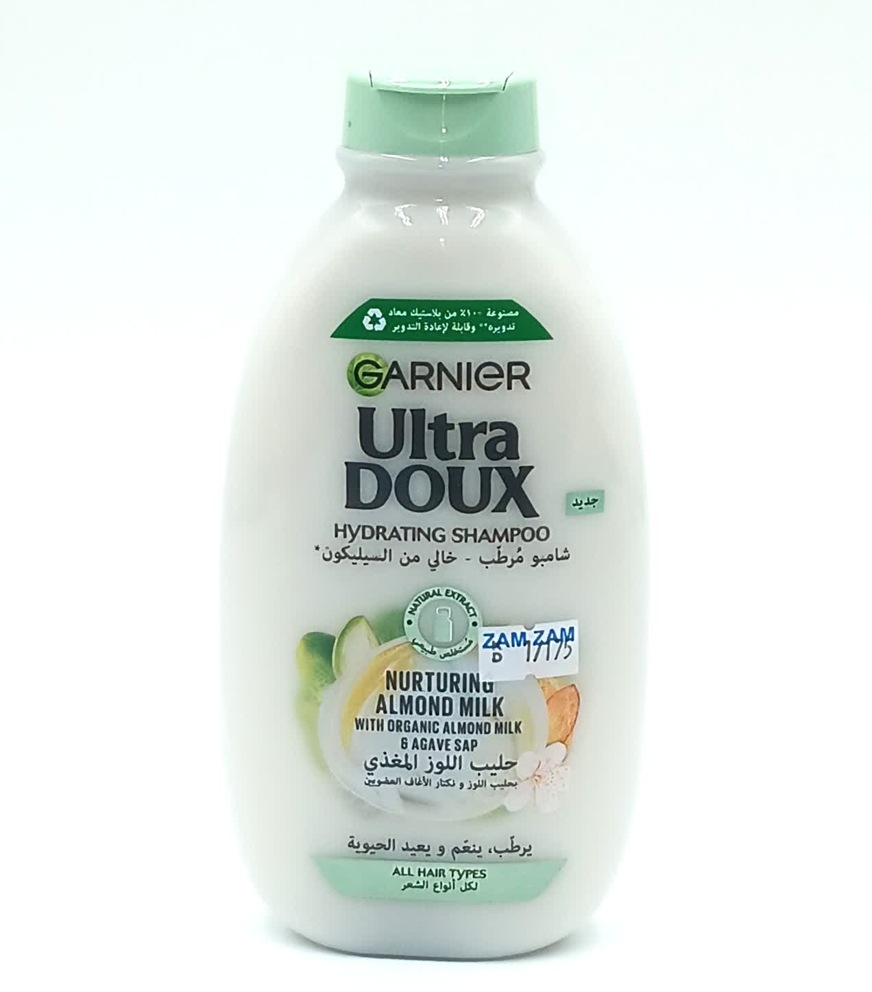 غارنييه الترا دو شامبو مرطب لكل انواع الشعر ينعم دون اثقال بحليب اللوز المغذي ونكتار الاغاف العضويين