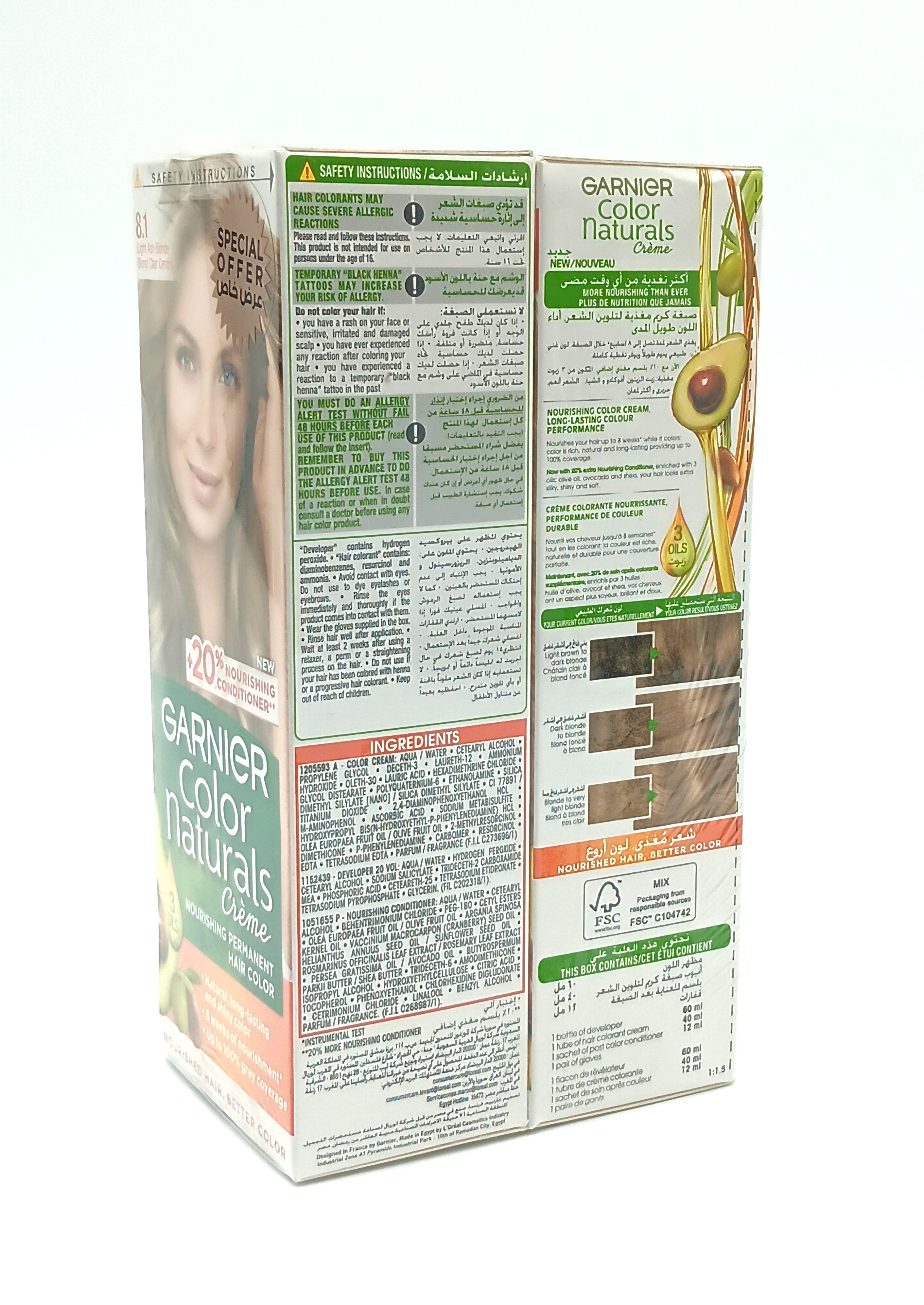 غارنييه كولور ناتشرلز كريم صبغة دائمة مغذية للشعر 3 زيوت لون اشقر رمادي فاتح 8.1 قطعتين